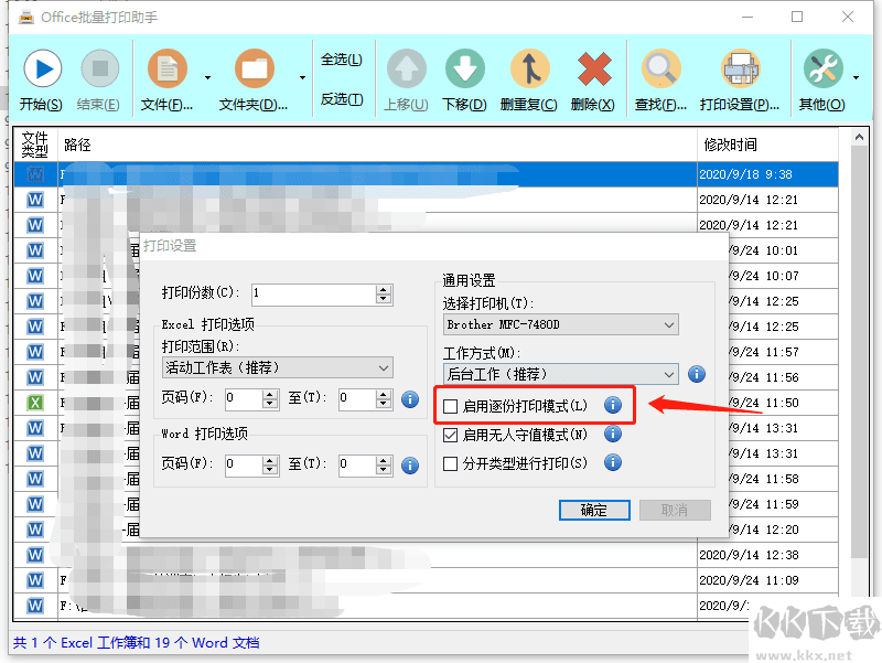 3、在使用中切記勾選“啟用逐份打印模式”,如果不勾選出來的文件順序?qū)牵旱谝粋€文檔第一頁,第二個文檔第一頁,第三個文檔第一頁,第一個文檔第二頁,第二個文檔第二頁,第三個文檔第二頁......