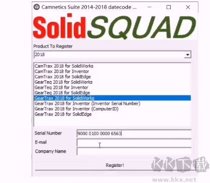 4、打開_SolidSQUAD_ 文件夾下Camnetics.Suite.2018.LicGen.01072017.SSQ.exe 注冊(cè)機(jī),選擇GearTrax 2018 sodworks 并粘貼生成的序列號(hào)進(jìn)去,隨便輸入個(gè)Email和公司名,然后點(diǎn)擊下面的reqister