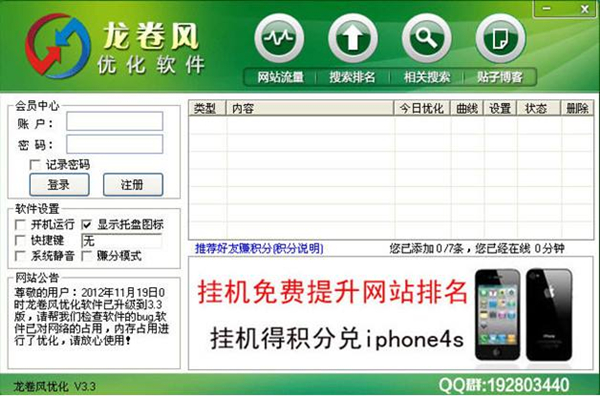 龍卷風(fēng)優(yōu)化軟件是一款可以幫助站長(zhǎng)、商家刷流量、排名、人氣的軟件,通過(guò)龍卷風(fēng)優(yōu)化軟件我們可以更好的提升網(wǎng)站排名,讓V,UV,IP都有全面的提升。