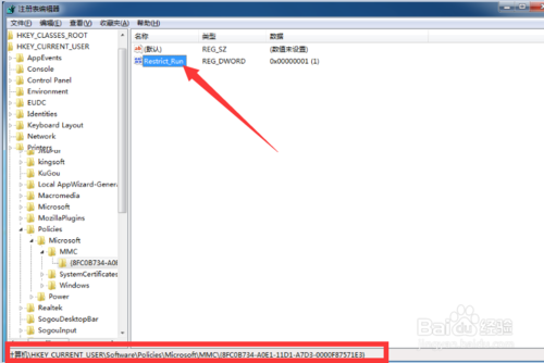 依次展開(kāi)“HKEY_CURRENT_USER\Software\Policies\Microsoft\MMC\{8FC0B734-A0E1-11D1-A7D3-0000F87571E3}”選項(xiàng),雙擊Restrict-Run選項(xiàng),將其值設(shè)置為”1“即可禁用組策略,設(shè)置為”0“即可恢復(fù)組策略使用。