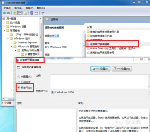 在右側(cè)找到“組策略對(duì)象編輯器”并雙擊打開(kāi)其屬性窗口,勾選”已禁用“項(xiàng),并點(diǎn)擊”確定“按鈕,此時(shí)將完成組策略編輯功能的禁用操作。