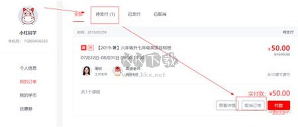 2、在訂單設(shè)置界面就可以看到剛剛下單的課程了,具體查看方法就是選擇“待支付”,在該界面下就可以看到還未支付的訂單,選擇對(duì)應(yīng)訂單點(diǎn)擊右邊的“取消訂單”即可。