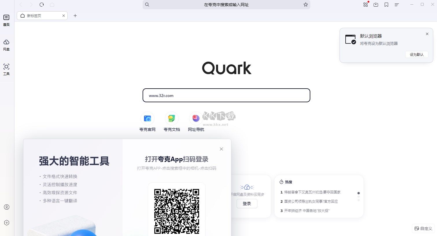 以左側邊欄一級入口設計,集成網(wǎng)盤和工具,與傳統(tǒng)PC瀏覽器有所不同,提供全新的界面風格。