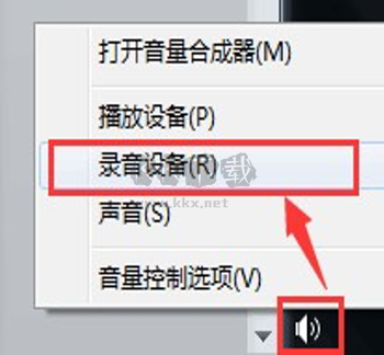 右鍵點擊桌面右下角的小喇叭圖標;選擇“錄音設(shè)備”;