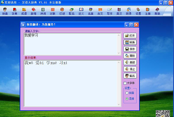 1、打開漢語大辭典,點(diǎn)擊“拼音”,輸入漢字會(huì)顯示結(jié)果,這里支持真人語音朗讀及語音文件輸出,全面支持電腦