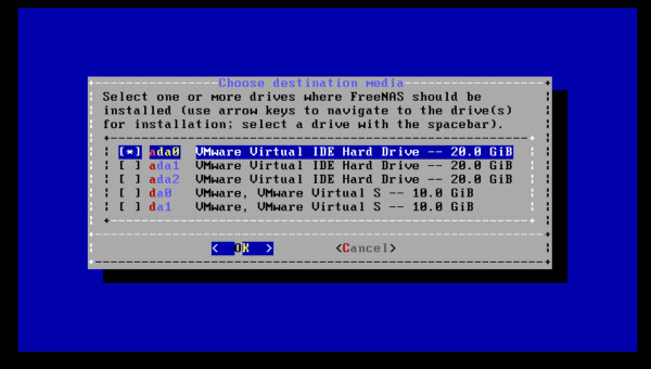 其中freenas將會安裝到一塊20G的硬盤中,freenas系統(tǒng)將會占用一整塊盤,這里多加了好幾塊硬盤不一定都用上,但是盡可能模擬真實(shí)環(huán)境吧。