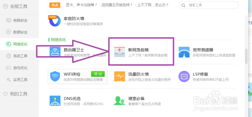 然后在安全衛(wèi)士的全部功能中找到網(wǎng)絡(luò)優(yōu)化下的“斷網(wǎng)急救箱”