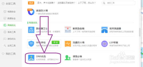 然后在安全衛(wèi)士的全部功能中找到網(wǎng)絡(luò)優(yōu)化下的“DNS優(yōu)選”,看看DNS問題,更換最佳的DNS。