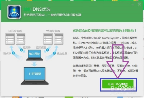 點(diǎn)擊進(jìn)入到“DNS優(yōu)選”,在頁面上我們可以看到“開始DNS優(yōu)選”。