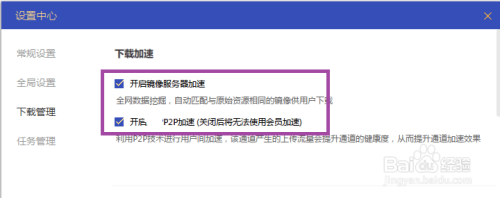 再然后就是在迅雷U享版的設(shè)置中心頁面上開啟鏡像服務(wù)器加速和P2P加速。