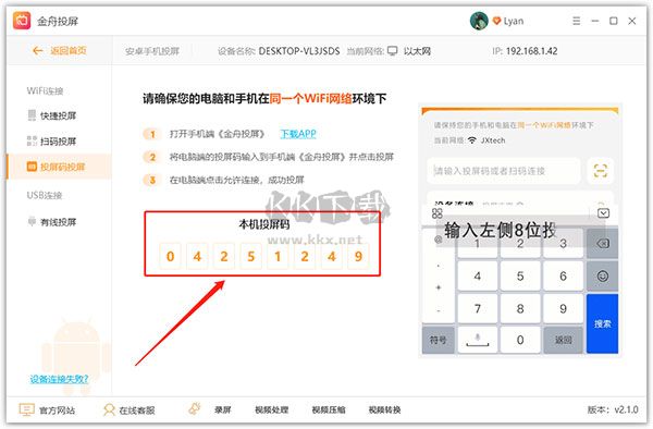 軟件支持手動(dòng)輸入投屏碼進(jìn)行投屏,投屏碼每隔一段時(shí)間后會(huì)自動(dòng)更新,所以請(qǐng)及時(shí)在手機(jī)端投屏APP中輸入正確投屏碼。