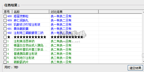 舉例: 表一中有表頭“藥品項目”,其中內(nèi)容為:“創(chuàng)可貼”,“碘伏”,“山楂丸”。表二中有表頭“藥品名稱”,其中內(nèi)容為:“碘伏”,“創(chuàng)可貼”,“棉簽”。本功能可以篩選出兩表中的不同之處,并生產(chǎn)報告表單。如:“山楂丸:表一有表二沒有”,“棉簽:表二有表一沒有”
