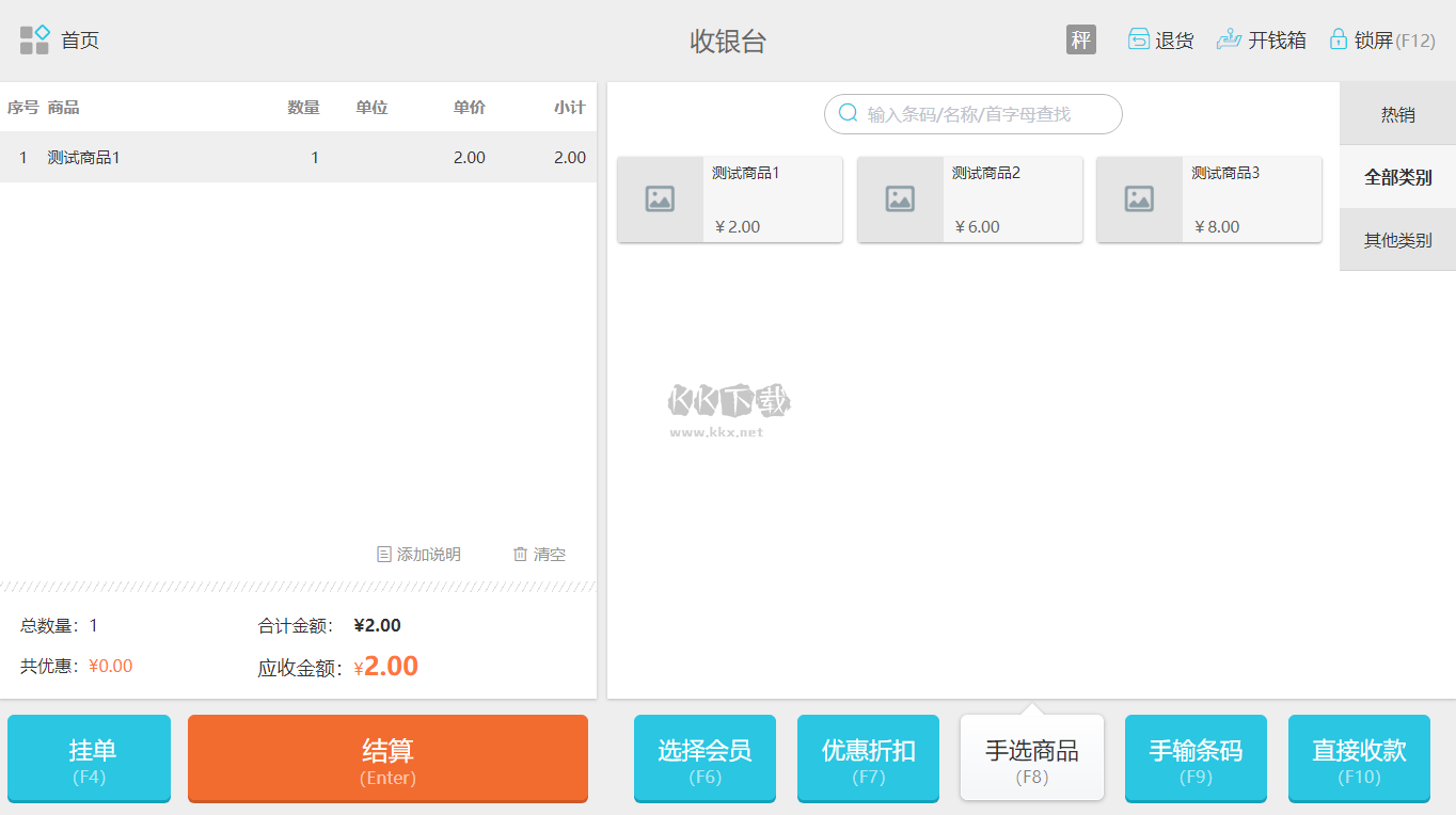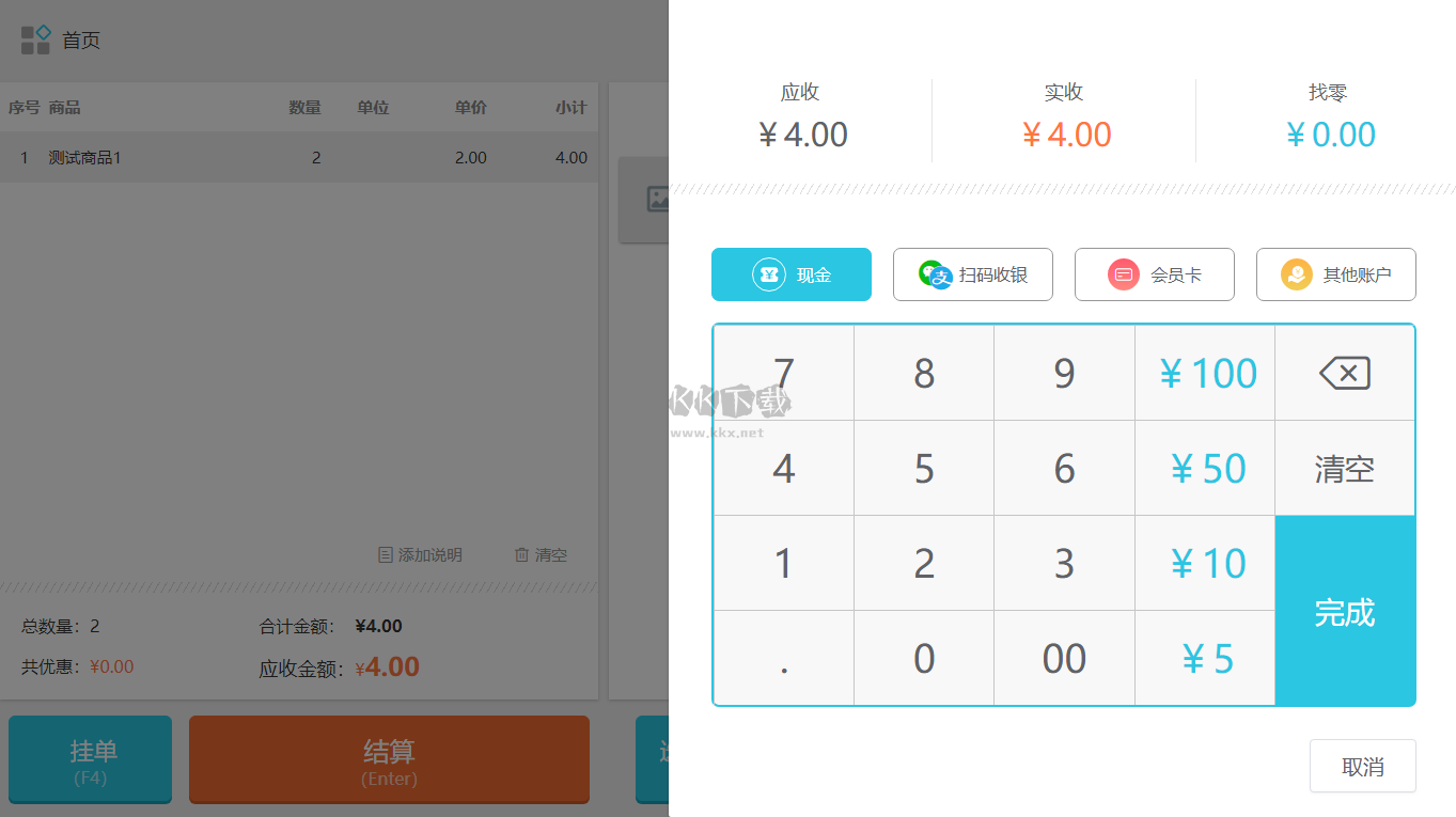 進(jìn)入收銀臺(tái)界面,首先選擇商品(可通過(guò)掃碼槍掃碼添加,或在右側(cè)手選添加),選擇好之后,點(diǎn)擊“結(jié)算”,進(jìn)入收銀界面。選擇收款方式,輸入收款金額,點(diǎn)擊完成即可。