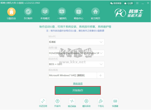 制作U盤(pán)啟動(dòng)盤(pán)。打開(kāi)韓博士裝機(jī)大師,選擇“U盤(pán)啟動(dòng)”功能;在U盤(pán)模式下,選擇需要安裝的系統(tǒng),然后點(diǎn)擊“開(kāi)始制作”。