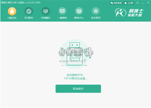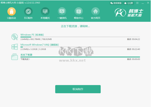 下載并制作啟動(dòng)盤(pán)。韓博士裝機(jī)大師會(huì)自動(dòng)下載所選系統(tǒng)并開(kāi)始制作啟動(dòng)U盤(pán)。