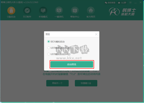 選擇“啟動(dòng)預(yù)覽”,韓博士裝機(jī)大師會(huì)進(jìn)行模擬啟動(dòng)。出現(xiàn)韓博士U盤(pán)系統(tǒng)維護(hù)工具界面,說(shuō)明U盤(pán)的制作成功。