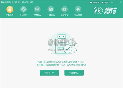第八步:U盤(pán)啟動(dòng)盤(pán)制作完成后,軟件會(huì)提示啟動(dòng)快捷鍵是哪個(gè)按鍵,按此鍵可通過(guò)設(shè)置U盤(pán)為第一啟動(dòng)項(xiàng),然后進(jìn)入韓博士PE系統(tǒng)。