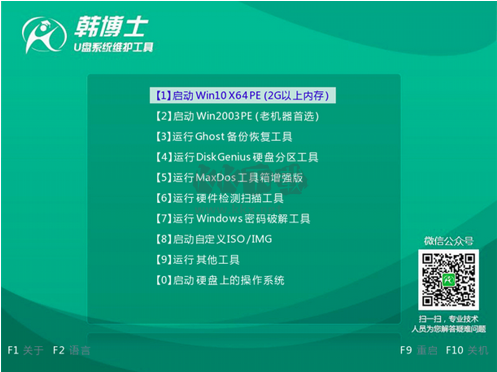 2.點(diǎn)擊USB選項(xiàng)后,接著會(huì)彈出韓博士PE菜單選項(xiàng)的界面,一般選擇“【01】啟動(dòng)Win10X64PE(2G以上內(nèi)存)”回車(chē)鍵確定即可。