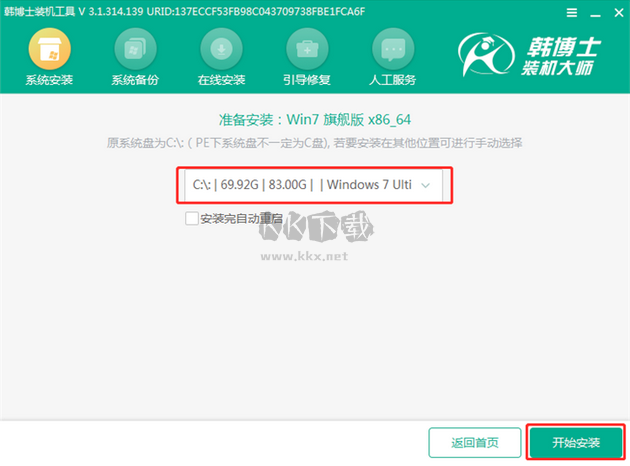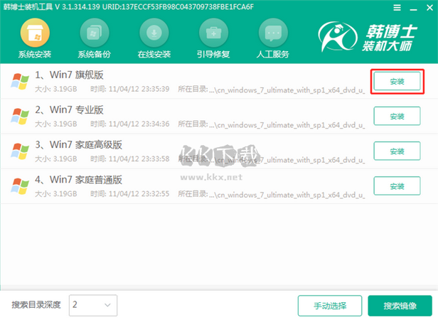 3.進(jìn)入PE界面后自動(dòng)彈出韓博士裝機(jī)工具,勾選U盤(pán)內(nèi)的“win7旗艦版”系統(tǒng),也可選擇自行下載的系統(tǒng)文件。點(diǎn)擊“安裝”;