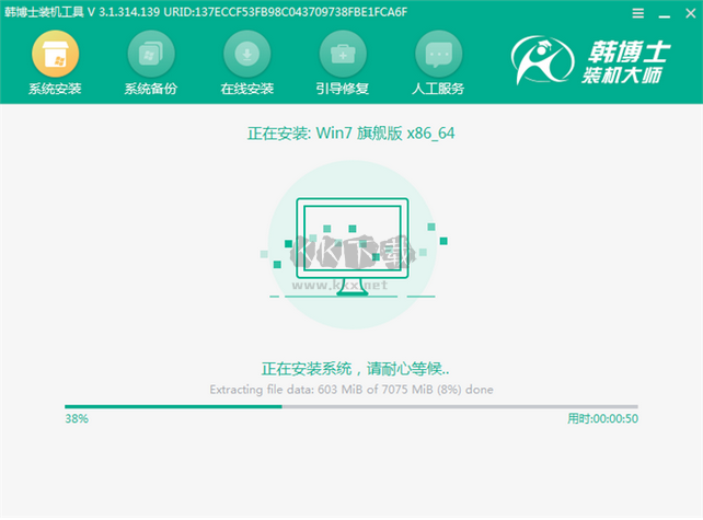 5.進(jìn)入安裝系統(tǒng)的狀態(tài)。韓博士裝機(jī)工具會(huì)幫你全自動(dòng)安裝,安裝過(guò)程中請(qǐng)保持通電正常,不要斷電或者關(guān)機(jī);