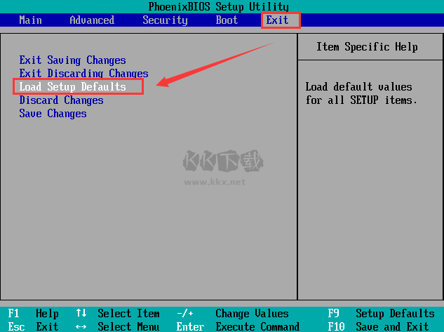 第一步:進入BIOS設(shè)置后,將選項卡切換至“Exit”,再按“↑”“↓”方向鍵選擇到“Load Setup Dwfaults”。如圖所示: