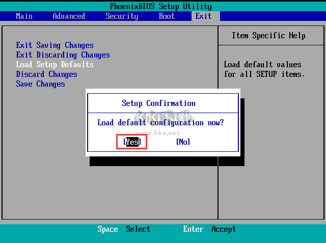 第二步:選擇到“Load Setup Dwfaults”后,當(dāng)跳出“Setup Confirmation”窗口后,按“←”“→”方向鍵選擇“yes”,再按“Enter”鍵確定。如圖所示: