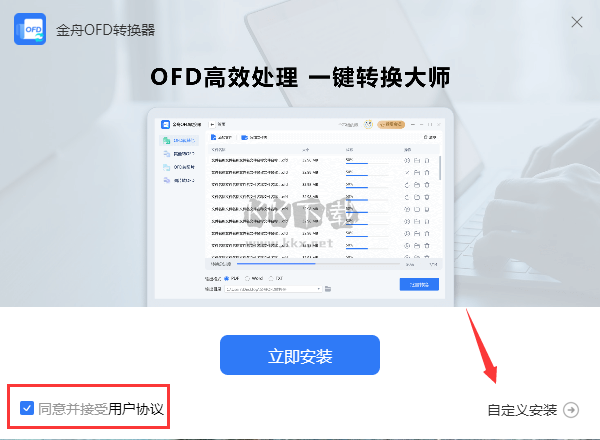 1、在本站下載金舟OFD轉(zhuǎn)換器官方版軟件包,雙擊開始安裝,勾選同意軟件安裝協(xié)議,然后點擊自定義安裝
