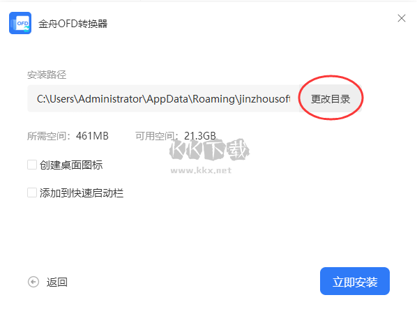 2、進(jìn)入自定義安裝界面,軟件默認(rèn)安裝位置為“C:UsersAdministratorAppDataRoamingjinzhousoftJZOFDConverter”,點擊“更改目錄”可以自主選擇安裝位置