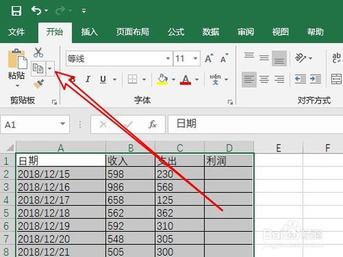 接下來在打開的開始工具欄上點擊“復(fù)制”下拉按鈕。