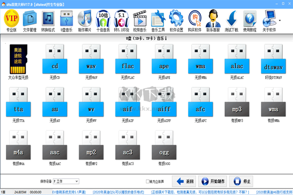 批量制作U盤、SD卡音樂;支持無損、有損、2.0、5.1環(huán)繞聲;支持14種格式;支持破解大眾車型。
