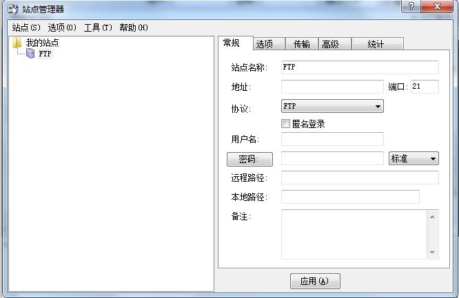 3、輸入一個站點名稱,然后輸入FTP站點的 IP地址或域名,端口號、取消勾選匿名,輸入用戶名、密碼應用保存;(如果有需要還可以進行高級設置)