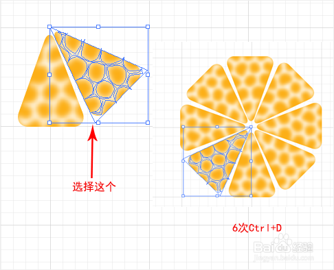 一個(gè)小技巧。有一個(gè)小技巧,很實(shí)用,就是用一個(gè)鍵盤快捷鍵(Ctrl + D)。它重復(fù)或應(yīng)用最新的變換到所選對(duì)象。選擇新的橙子瓣并使用“Ctrl + D”6次。瞧! 我們有一個(gè)美味的橙子了。
