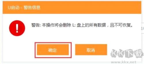 3.此時(shí),系統(tǒng)會(huì)彈出警告提示會(huì)清除u盤上所有的數(shù)據(jù),確認(rèn)u盤中沒(méi)有重要文件之后點(diǎn)擊“確定”開(kāi)始制作。(如有重要文件,請(qǐng)先將U盤的文件復(fù)制到其他計(jì)算機(jī)上再開(kāi)始制作);如圖所示: