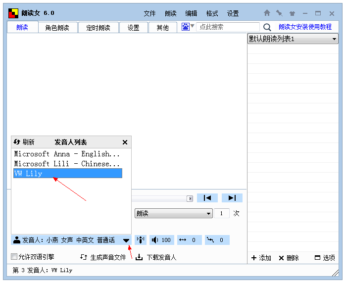 3、安裝好語音庫后,打開朗讀女軟件,選擇該語音庫就可以用它來朗讀文本了。