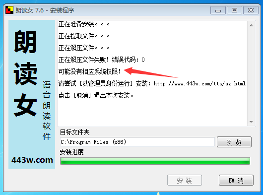 如下圖所示就是由于沒有使用管理員身份安裝導(dǎo)致的;