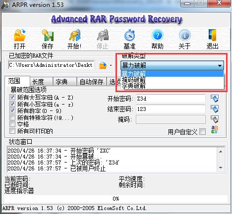 全自動儲存密碼恢復情況,便于客戶在忽然終止或奔潰后能夠恢復WinRAR密碼過程。