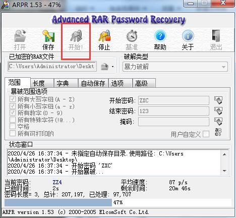 如果你選擇使用“Brute-force”或“Mask”掃描設置,程序界面中的“Brute-force range options”項中的各個復選框都是可以使用的,其中主要包括了掃描控制設置,如掃描所有大寫字符“All caps latin (A - Z)”、掃描所有小寫字符“All small latin (a - z)”、掃描數字字符“All digits (0 - 9)”、掃描所有特殊字符“All special symbols (!@…)”、空格“Space”、所有格式字符“All printable”,你可以使用以上各個復選框的組合進行口令掃描,如果你能確認口令是由這些樣式組合而成的。此外,你可以在“Start from”文本框中設置程序可以開始掃描的字符,如你記得口令大致是以“p”開頭的四個字符,可在其中鍵入“paaa”,表示第一個字符是p,對于其他字符從a開始掃描,到z結束。而對于使用Mask方式掃描,可以自己輸入掃描格式,比如壓縮包的口令是“zhangxp”,而你只記得口令是七個字符,第一個字符是“z”、最后一個是“p”,此時可以在“Mask”文本框中輸入“z???p”。
