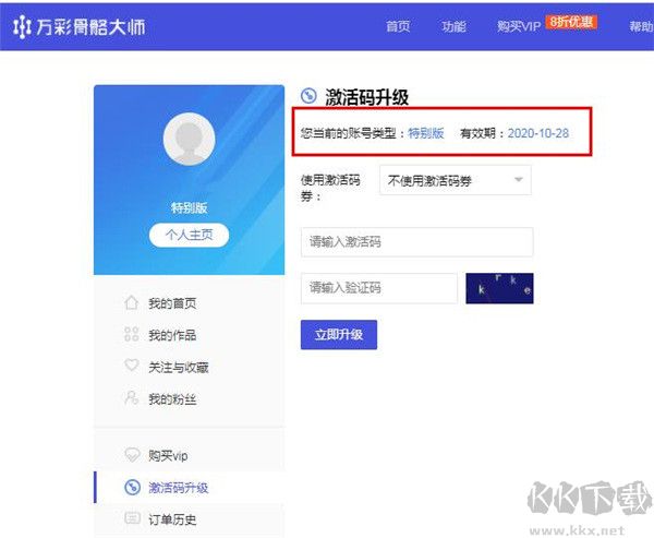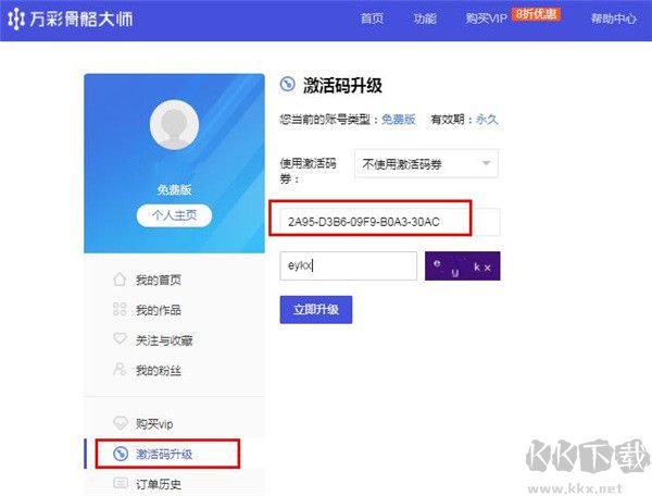 2、登錄之后點(diǎn)擊“我的首頁”選擇激活碼升級,然后輸入上面小編分享的激活碼