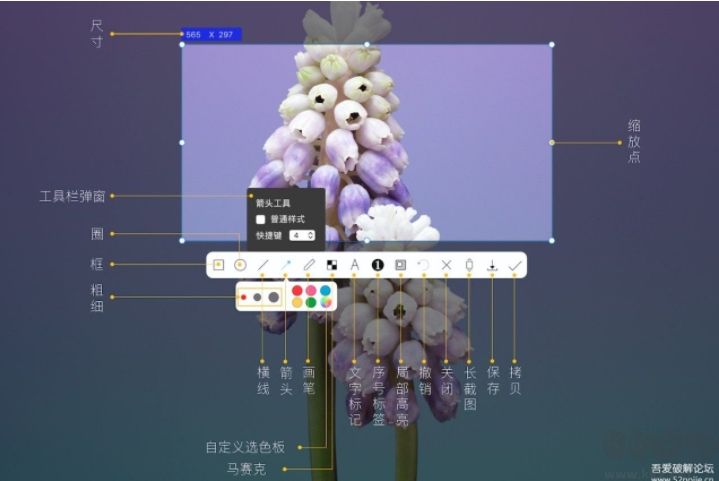 iShot截圖工具欄提非常豐富常用功能,包括標(biāo)注線框、箭頭、文字、打碼等等,而且所有功能都可以用快捷鍵操作,基本不需要用其他軟件進(jìn)行二次標(biāo)記處理。
