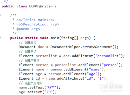 下面我們來完成寫XML文件的操作,和之前介紹的其他解析XML文件的工具一樣,我們首先需要?jiǎng)?chuàng)建文檔,然后定義各個(gè)節(jié)點(diǎn)和子節(jié)點(diǎn)。如下圖所示,我們可以看出使用DOM4J操作非常的簡單,在創(chuàng)建節(jié)點(diǎn)的時(shí)候便建立了節(jié)點(diǎn)之間的關(guān)系,其他的解析工具不能一步完成,然后給各個(gè)節(jié)點(diǎn)設(shè)置內(nèi)容。