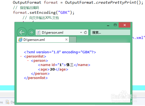 運(yùn)行程序,我們可以使用瀏覽器或文本編輯器打開XML文件,結(jié)果如下圖所示。如下圖所示,在person節(jié)點(diǎn)下面創(chuàng)建了name節(jié)點(diǎn)和age節(jié)點(diǎn),同時(shí)給name節(jié)點(diǎn)一個(gè)id屬性,值為1。