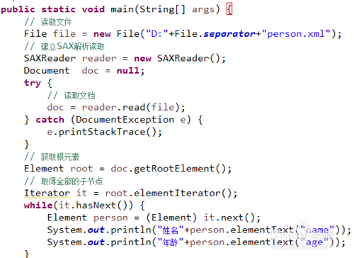 接著我們來實(shí)現(xiàn)讀取以上步驟中創(chuàng)建的XML文件,DOM4J同樣使用SAX建立解析器,然后通過文檔依次找到根節(jié)點(diǎn),再通過根節(jié)點(diǎn)找到每一個(gè)節(jié)點(diǎn)的內(nèi)容,最后打印輸出每個(gè)節(jié)點(diǎn)的內(nèi)容。
