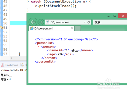 運(yùn)行程序后,結(jié)果如下圖所示,我們通過對(duì)比控制臺(tái)輸出的結(jié)果和XML原文件,可以發(fā)現(xiàn)DOM4J能夠快速而準(zhǔn)確的解析出XML文件。