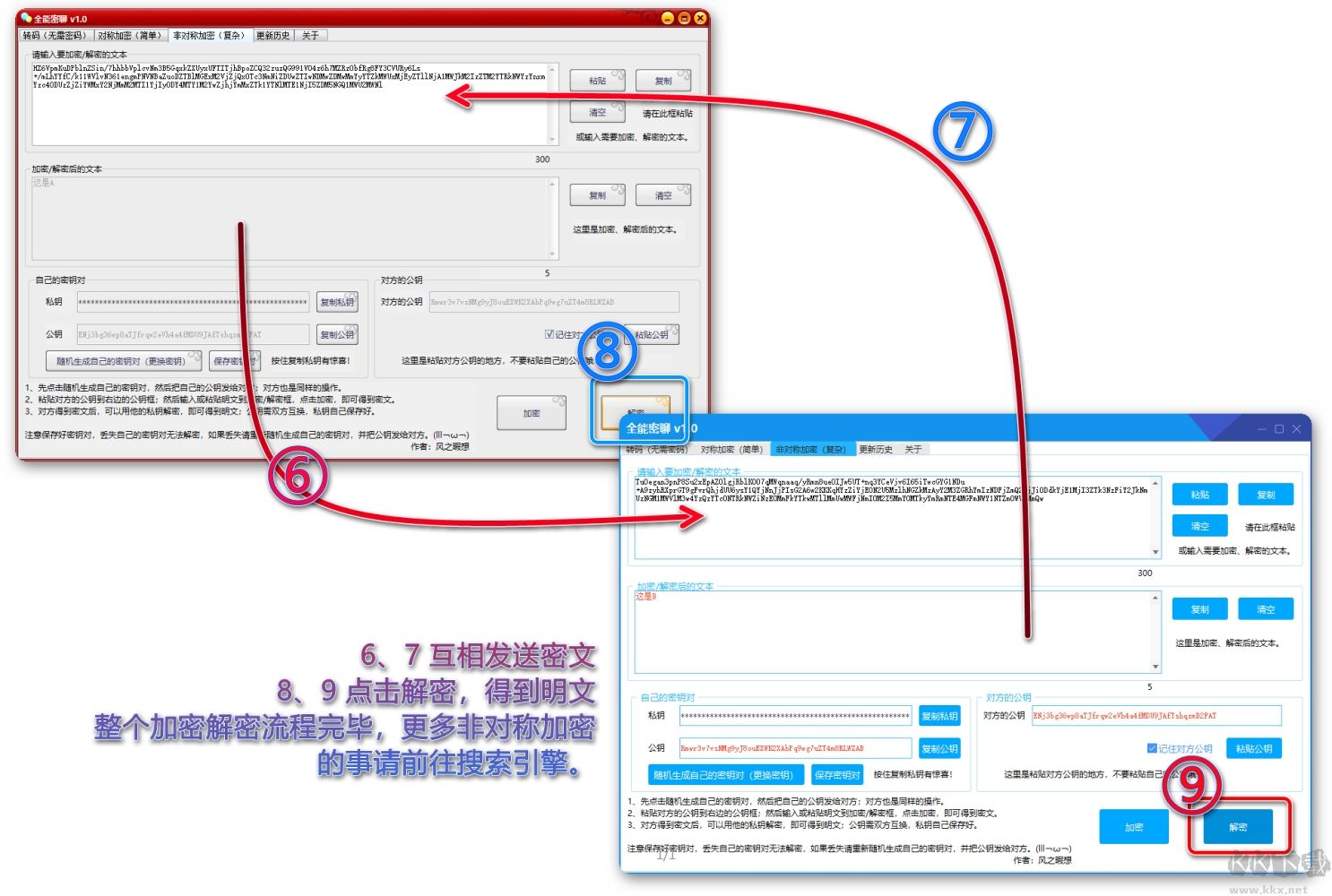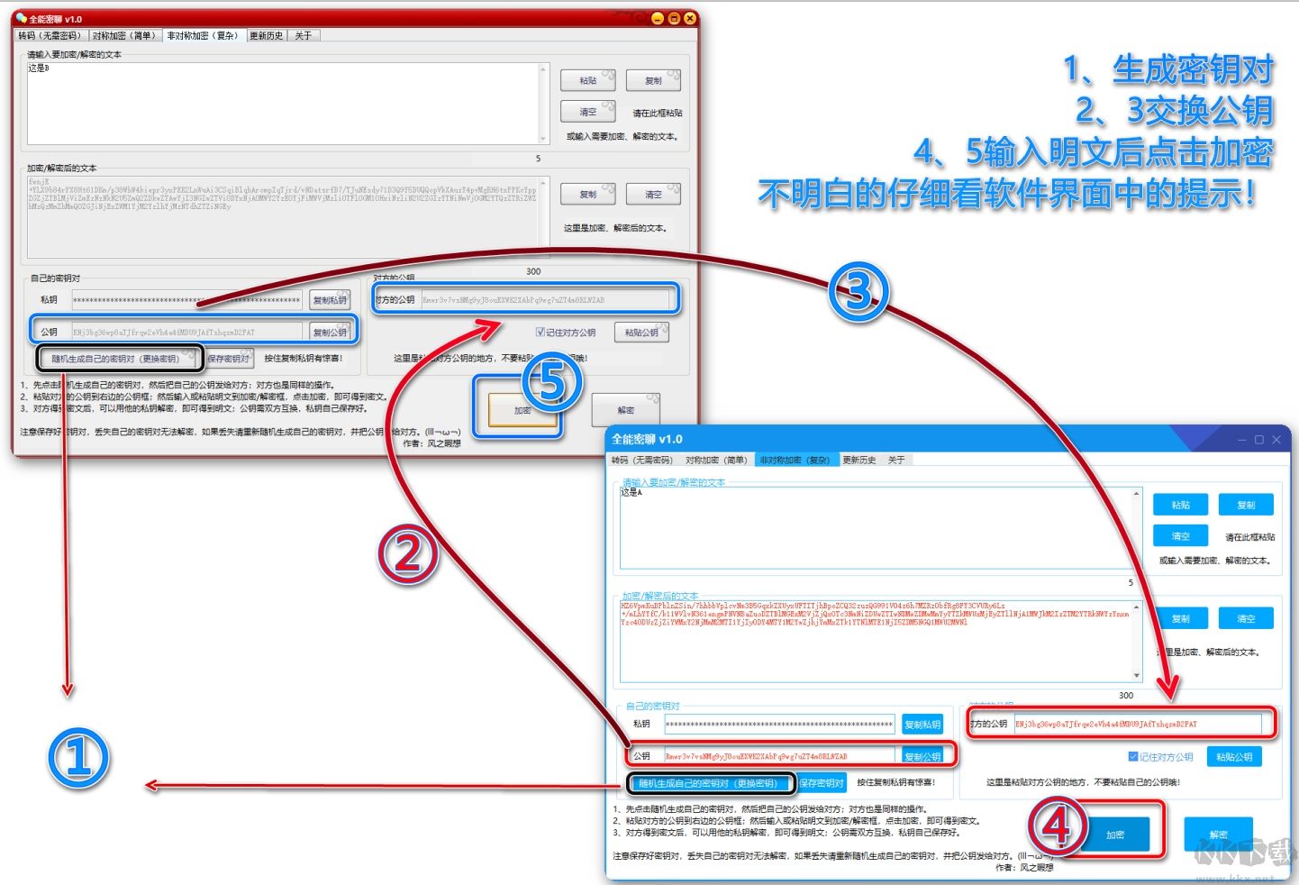 對(duì)方:生成密鑰對(duì)——互相交換公鑰——輸入想說的話——加密——發(fā)送給對(duì)方——收到密文——粘貼到解密框——解密——獲得明文