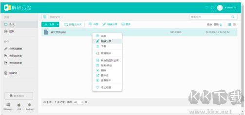 2、右擊文件,選擇共享或鏈接分享。共享可以與同企業(yè)內(nèi)的云盤用戶快速分享該文件;鏈接分享可以為文件生成鏈接,并配置權(quán)限,與任何人分享。將設(shè)計文件發(fā)送給客戶或印刷廠時,可以選擇鏈接分享。