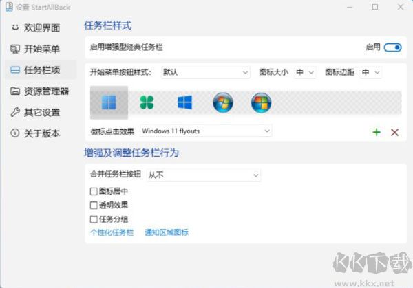 在任務(wù)欄行為上,你可以設(shè)置任務(wù)欄按鈕的合并方式(始終合并、任務(wù)欄滿時合并或從不合并),你甚至還可設(shè)置任務(wù)欄圖標(biāo)居中、透明效果以及右下角任務(wù)欄的系統(tǒng)圖標(biāo)等~
