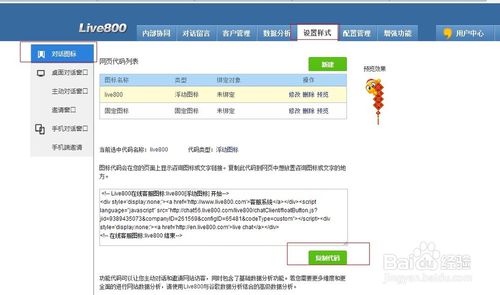 配置管理-設(shè)置樣式-對話圖標(biāo),將對應(yīng)網(wǎng)頁代碼的圖標(biāo)代碼及功能代碼按照后面的操作提示復(fù)制到您網(wǎng)站源代碼中; 分別為:將圖標(biāo)代碼復(fù)制到網(wǎng)頁中您想放置Live800圖標(biāo)或文字的地方;將功能代碼復(fù)制到網(wǎng)頁代碼中最后一個</body> 前。 當(dāng)訪客訪問您的網(wǎng)站時,只需點擊這個咨詢圖標(biāo),就可與客服進(jìn)行實時交流。