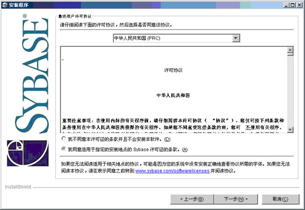 4、如上圖:選擇“中華人民共和國(prc)”,這里如果你英文好,你也可以選擇安裝英文版的,在選擇“我同意適用于指定的安裝地點(diǎn)的Sybase許可證條款”,然后在點(diǎn)擊“下一步”進(jìn)行安裝,