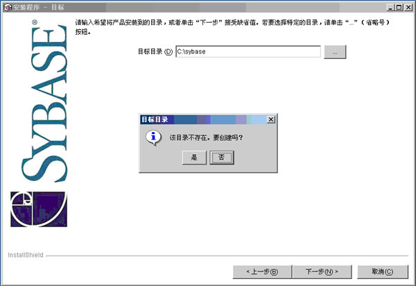 6、點(diǎn)擊“下一步”安裝的時候提示不存在該目錄,問是否要創(chuàng)建“sybase”安裝目錄。你只點(diǎn)擊“是”,就可以自動創(chuàng)建“sybase”目錄,如下圖: