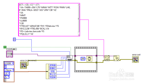 復(fù)制PRN文件中的文本內(nèi)容,在labview中創(chuàng)建如圖所示的程序框圖,將復(fù)制的文本內(nèi)容粘貼在字符串常量中,選擇打印機(jī)的串口,運行該VI就能打印出我們需要的標(biāo)簽了。